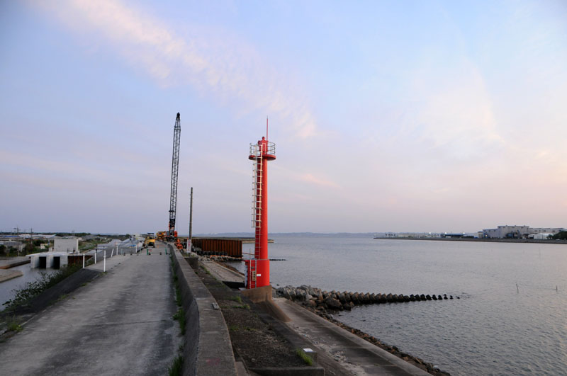 知多湾にそそぐ平坂入江の河川敷きに建つ赤灯台は漁業船の右舷標識となっています。