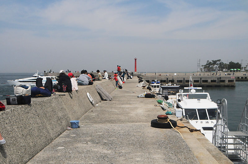 クランク状の堤防を歩いて灯台へ。ここも釣り人天国でした。観光船や定期船、釣り渡船など数分ごとに入出港があり楽しかった。