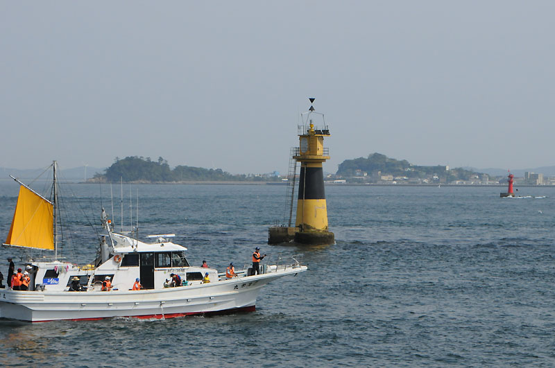 ゴールデンウイークだったので釣り渡船もたくさん出ていました。赤塔は下瀬礁灯標です。