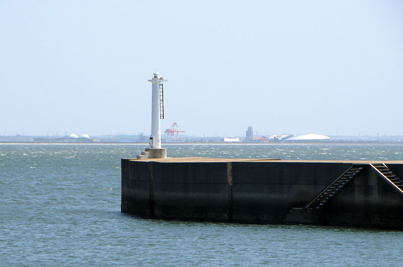 三河港海陽ヨットハーバー西防波堤灯台は「ラグーナ蒲郡」の西側にある「豊田自動織機海陽ヨットハーバー」の防波堤にある灯台です。名前は民間標識っぽいですがこの形は海保直営ではないでしょうか?灯台はスタンダードなプラスチック製の小型灯台で灯器は平たいタイプのLED灯でした。