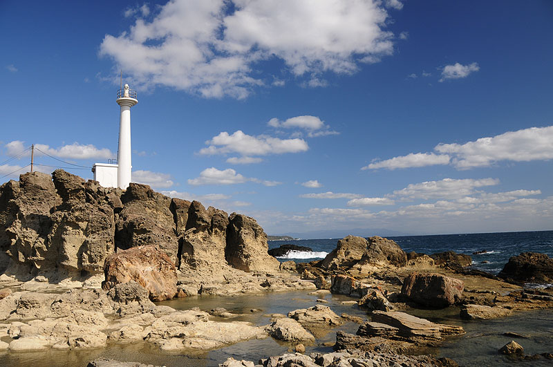 男鹿半島の西南端の岩場に立っています。入道埼灯台より南下する県道から見えてきます。