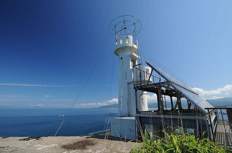 灯台は小型だが岩手県の陸中弁天埼灯台と同じ形。灯台には巨大なソーラパネルが数枚並んでいる。