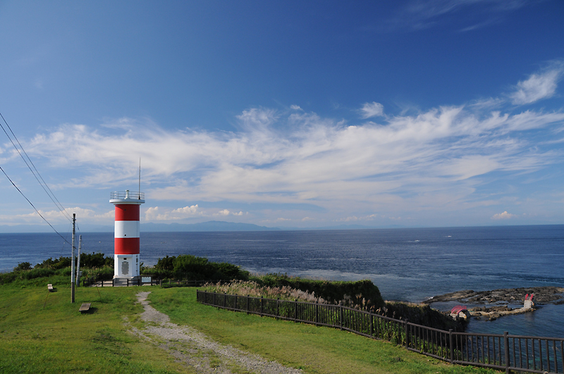 高野埼灯台はキャンプ場のある岬の先端にある。更に先には遊歩道が浜辺に繋がっていて、この日も多くの人が歩いていた。視界は広がりなかなかの景色で遠く北海道も見える。