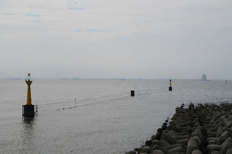 沖には風の塔。そしてその手前には東京湾アクアライン海ほたる西方灯標も見えます。