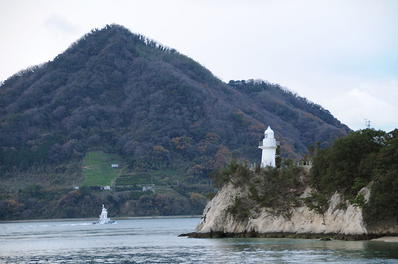 船の上から見た大久野島灯台。だんだん近づく感じです。