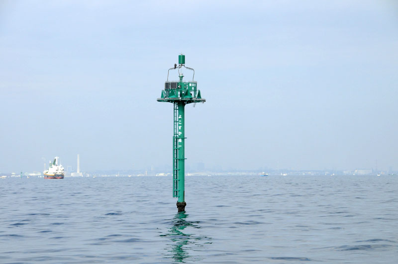 三笠桟橋から第二海堡へ向かう途中でわりと近くに見ることが出来ました。この形はおそらく浮体式灯標だと思います。