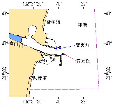 2010年604項 伊勢湾 ― 津港 灯台名称等変更 (四管区水路通報 22年 523項 削除) 津港北防波堤灯台(灯台表第一巻、航路標識番号2729)は、一時変更中のところ、下記のように 変更された。 名 称 (変更後)津港岩田川南防波堤灯台 (変更前)津港北防波堤灯台 位 置 (変更後)34-42-33N 136-31-44E (変更前)34-42-37N 136-31-38E 塗色及び構造(変更後)白色 塔形 (変更前)赤色 塔形 灯 質 (変更後)連成不動単閃緑光 毎3秒に1閃光 (変更前)単閃赤光 毎6秒に2閃光 光達距離 (変更後)閃光5.0海里 不動光2.0海里 (変更前)5.0海里 高 さ (変更後)地上から構造物の頂部まで5.4m 平均水面上から灯火まで9.9m (変更前)地上から構造物の頂部まで9.1m 平均水面上から灯火まで11m 海 図 W88 出 所 第四管区海上保安本部